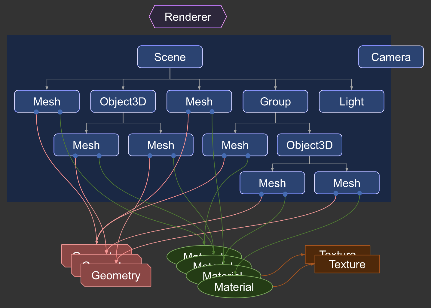 Mesh는 어떤 Material로 하나의 Geometry를 그리는 객체입니다. Material, Geometry는 재사용이 가능하여 여러 개의Mesh가 하나의 Material 또는 Geometry를 동시에 참조할 수 있습니다. 파란색 정육면체 2개를 그린다고 해보죠. 일단 두 정육면체의 위치가 달라야 하니, 2개의 Mesh가 필요합니다. 그리고 정점(vertext, 꼭짓점) 데이터를 가진 한 개의 Geometry와 채색을 위한 하나의 Material이 필요하겠죠. 이때 각 Mesh는 객체를 복사할 필요 없이, 같은 Geometry 그리고 Material을 참조할 수 있습니다.