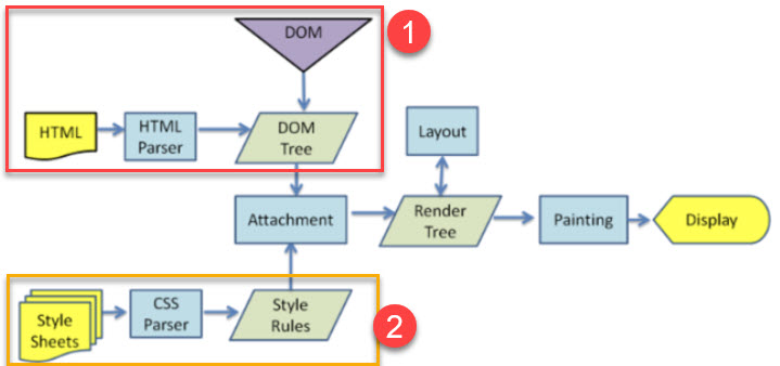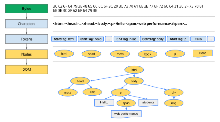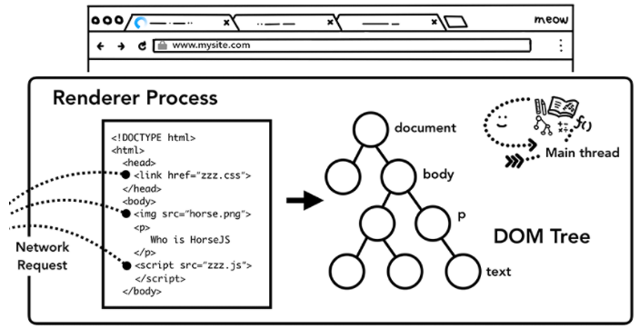 이 과정은 바이트를 문자로, 문자열을 <body>와 같은 토큰으로, 토큰을 프로퍼티와 규칙을 가진 객체로 만들고 최종적으로 이 객체들을 서로 연결하면서 데이터 구조를 만드는 순서로 진행된다. 여기까지의 과정이 아래 그림의 1번이라고 할 수 있다.