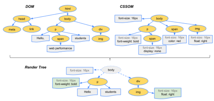 이제 렌더러 프로세스는 문서의 구조(DOM)와 각 노드에 대한 스타일(CSSOM)을 알게 되었다. DOM 트리와 CSSOM 트리를 렌더 트리(Render Tree)로 결합되어, 표시 요소의 레이아웃을 계산하는데 사용되며, 픽셀을 화면에 렌더링 하는 페인트 프로세스에 대한 입력 역할을 한다. 렌더 트리에는 페이지를 렌더링 하는데 필요한 노드만 포함한다.