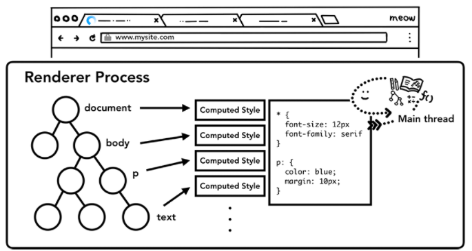 DOM을 생성한 것만으로 페이지가 어떻게 보이는지 알기에는 부족하다. CSS로 페이지 요소들에 대한 스타일을 정의할 수 있기 때문이다. 그래서 메인 스레드는 CSS를 파싱 하여 각 DOM 노드에 대한 계산된 스타일(Computed Style)을 결정한다. 이는 CSS selector를 기반하여 각 요소들에 어떤 스타일이 적용되었는지에 대한 정보다.