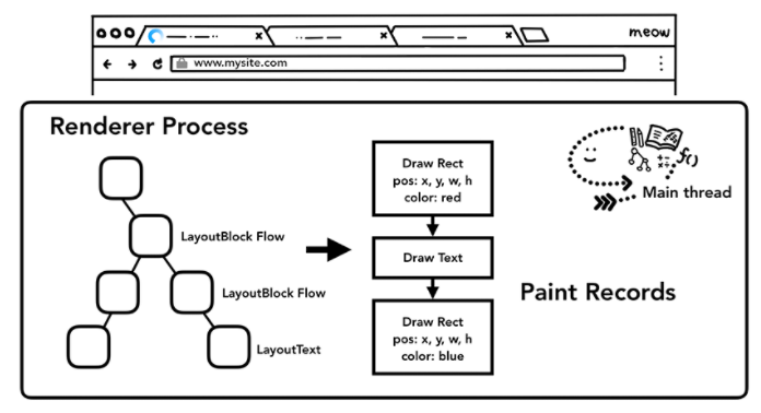 위 과정에서 요소들의 크기, 모양, 위치까지 알았지만, 아직 어떤 순서로 그릴지 판단하는 과정이 남았다. 예를 들어 z-index를 고려하지 않으면 잘 못된 레더링 이미지가 나올 수 있다. 이 페인트 단계에서는 메인 스레드는 레이아웃 트리를 따라가 페인트 기록을 생성한다.