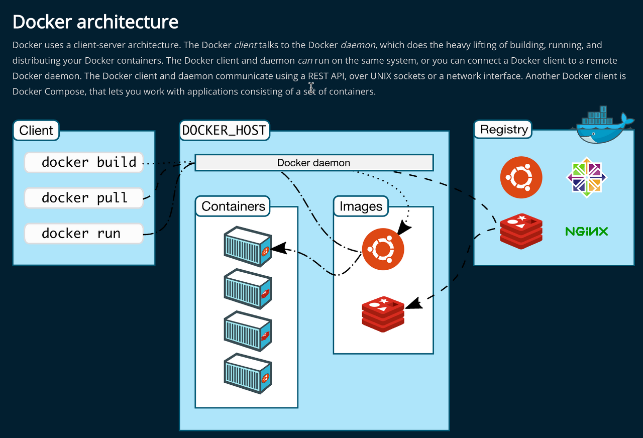 위에 설명을 보고 이제 도커 공식문서에 나온 아키텍처를 보면 아주 조금! 알까 말까한 느낌이 들면서도 더 알고 싶은 학습욕이 솟구치게 된다(?). 가즈아!