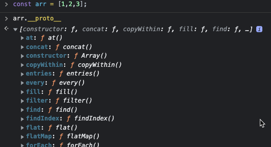 arr의 prototype을 확인해 보면 undefined이고 위 코드에서 확인할 수 있다시피 따로 프로토타입에 만들어 놓은 메서드는 없다. 하지만 map이나 filter등 내가 정의하지 않는 메서드를 사용할 수 있는데, 이 이유가 프로토타입 링크에 의한 탐색 때문인 것이다.