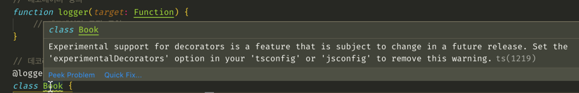 → 다만 데코레이터는 실험적인 기능이기 때문에 tsconfig.json파일에서 옵션을 수정해야 한다.