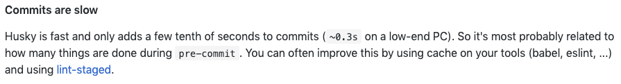 또한 리뷰시에 lint에 대한 부분을 고려하지 않고 코드에 집중할 수 있다는 장점도 있습니다. 다만, `husky`의 단점은 `husky`만 적용시에는 모든 파일을 모두 `commit`시마다 검사합니다.