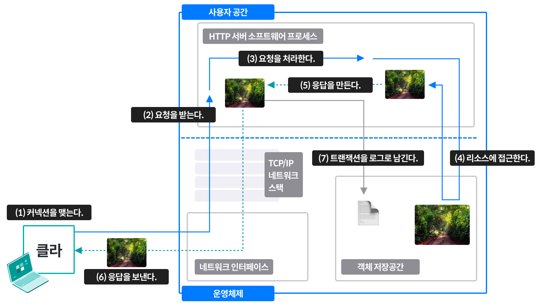 마지막으로 트랜잭션이 완료되었을 때 웹 서버는 트랜잭션이 어떻게 수행되었는지에 대한 로그를 로그 파일에 기록한다.