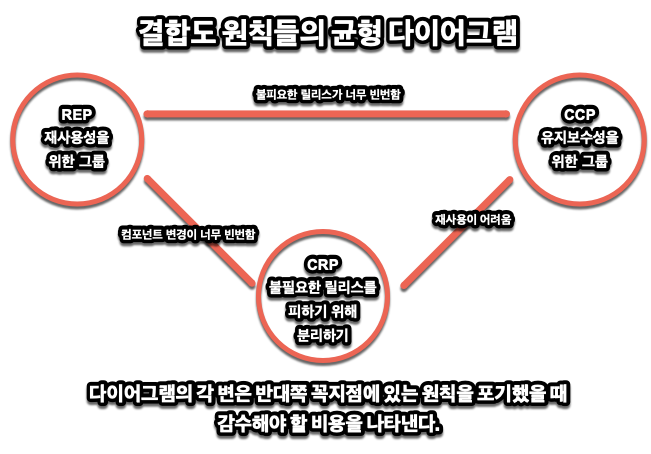 위의 세 원칙은 사실 서로 상충된다. REP와 CCP는 포함(inclusive) 원칙이며, 이 두 원칙은 컴포넌트를 더 크게 만든다. 반면 CRP는 배제(exclusive) 원칙이며, 컴포넌트를 더욱 작게 만든다. 뛰어난 아키텍트라면 이 원칙들이 균형을 이루는 방법을 찾아야 한다.