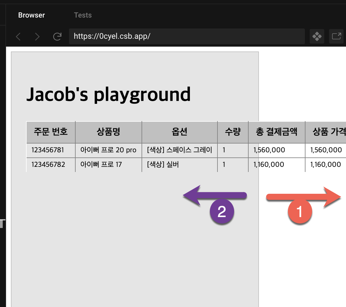 음? 개발자야 맥북과 별도의 트랙패드를 자주 쓰기 때문에 저렇게 해도 생산성에는 영향이 거의 없다. 하지만, 다른 운영 직군 사람들은 데스크톱을 많이 사용하기 때문에 키보드 + 마우스 조합으로 많이 사용한다. "그럼 가로 스크롤을 대체 어떻게 해야 되지?"라는 의문이 들 것이고, 옆에 데이터를 보기 위해 영역을 잡고 드래그하고 있을 것이다. 지금은 몇 줄 없어서 생산성에 별 영향이야 없겠지만, 한 페이지에 200줄이라고 쳐보자. 주문번호 1111의 맨 오른쪽 데이터를 보고 싶어서 드래그했는데, 드래그하면서 마우스가 위아래로 조금만 흔들렸다면, 원하는 데이터를 보기 위해 몇 번이건 마우스를 드래그하고 있을 것이다.
