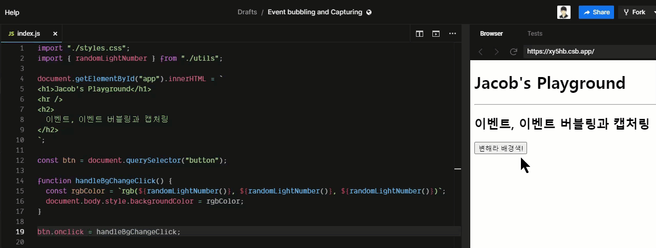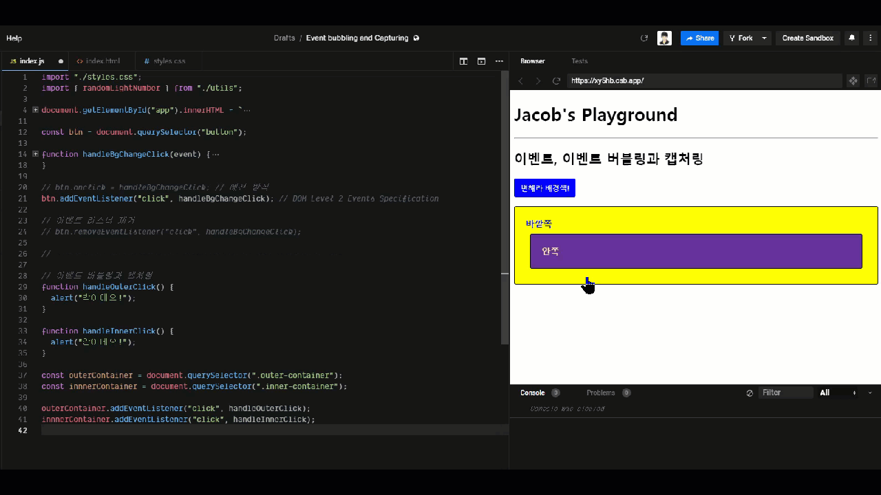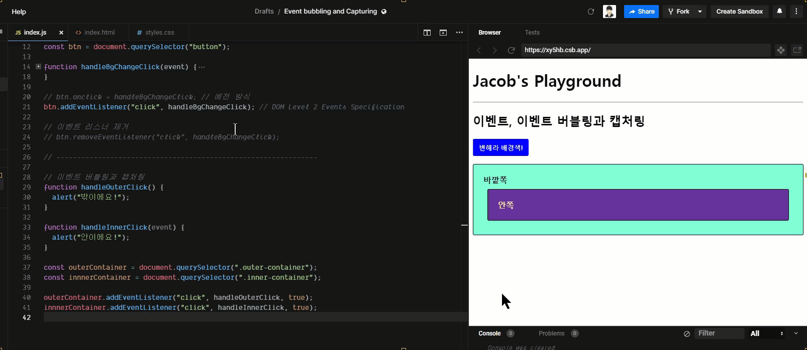 실제로 구현해 봐도 이벤트 버블링이 기본적으로 설정돼 있음을 알 수 있다.
