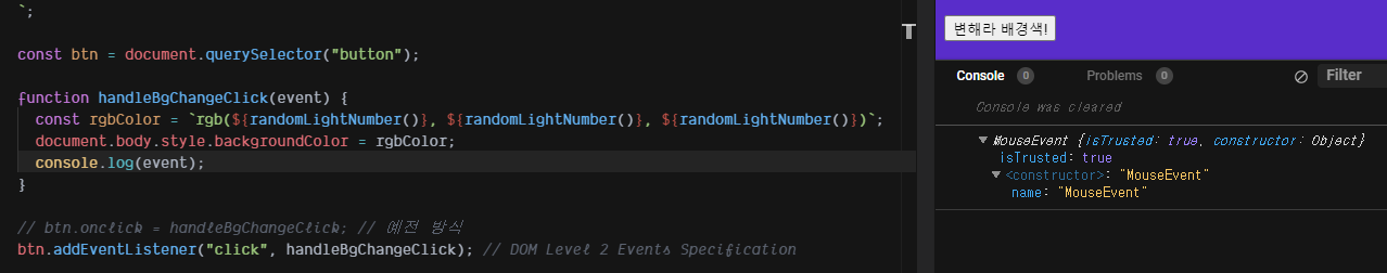 btn.addEventListener("click", handleBgChangeClick); // DOM Level 2 Events Specification