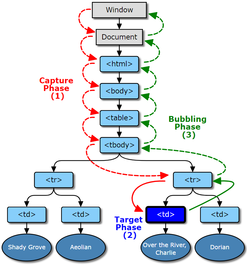 위 그림은 이벤트가 DOM Tree를 통해 전파되는 방법을 설명한다. 프로그램은 dispatchEvent() 메서드를 사용하여 이벤트 개체를 전달할 수 있으며, 이벤트 객체는 DOM 이벤트 흐름에 의해 결정된 대로 DOM Tree를 통해 전파된다.
