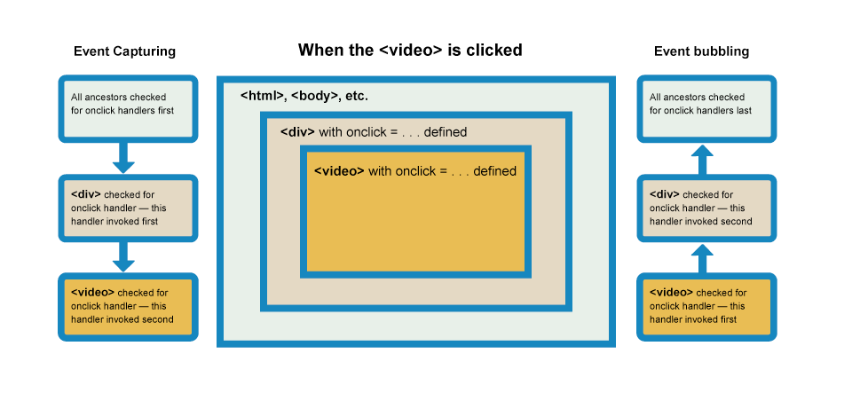 부모에서 자기 자신에게 이벤트가 전파되면 이벤트 캡쳐링(event capturing)이라고 한다. 만약 캡쳐링을 설정하고 싶다면 addEventListener의 세 번째 인자로 true를 주면 된다.