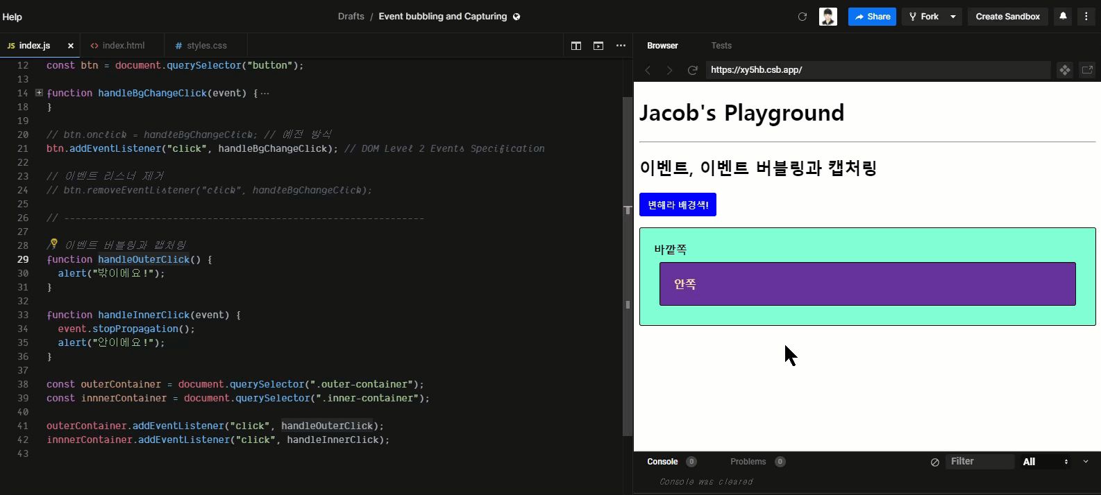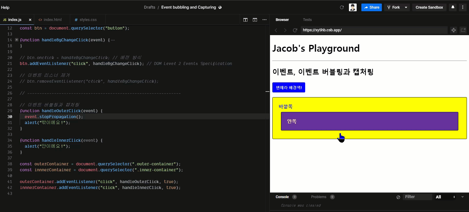 event.stopPropagation()를 통해 이벤트 버블링을 막는다면 이제 더 이상 버블링이 일어나지 않으므로 handleOuterClick 핸들러는 동작하지 않는다.