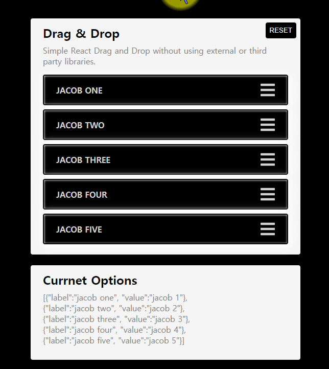atlassian에서 만든 react-beautiful-dnd를 이것저것 궁금해져, 내부 코드를 보기 전에 기본 구현 학습을 위해 먼저 만들어 봤다. 자연스러운 애니메이션이나 특별한 기능은 없지만, 기본 드래그 앤 드롭이 어떻게 동작하는지 학습하는 데에는 나쁘지 않은 경험이었다(쉽지 않아~~).