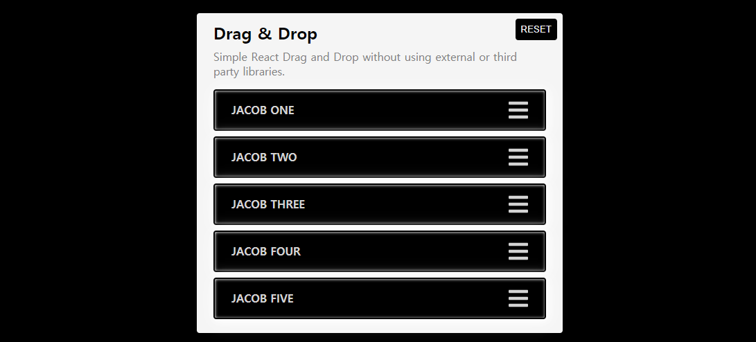 atlassian에서 만든 react-beautiful-dnd를 이것저것 궁금해져, 내부 코드를 보기 전에 기본 구현 학습을 위해 먼저 만들어 봤다. 자연스러운 애니메이션이나 특별한 기능은 없지만, 기본 드래그 앤 드롭이 어떻게 동작하는지 학습하는 데에는 나쁘지 않은 경험이었다(쉽지 않아~~).