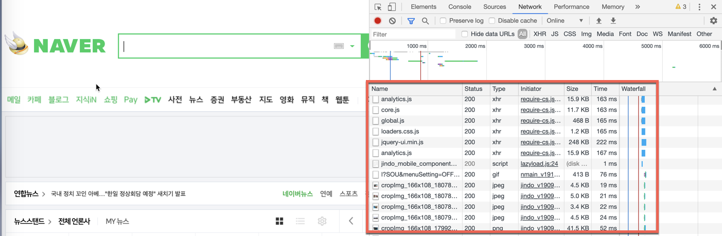 예를 들어 네이버(www.naver.com) 홈페이지를 들 수 있다. 네이버 페이지에 접속할 때 개발자 도구의 네트워크 탭을 확인해 보자. 대량의 HTTP 트랜잭션을 수행한다. 이때 리소스들을 다른 서버에 위치한 거 일 수도 있다.