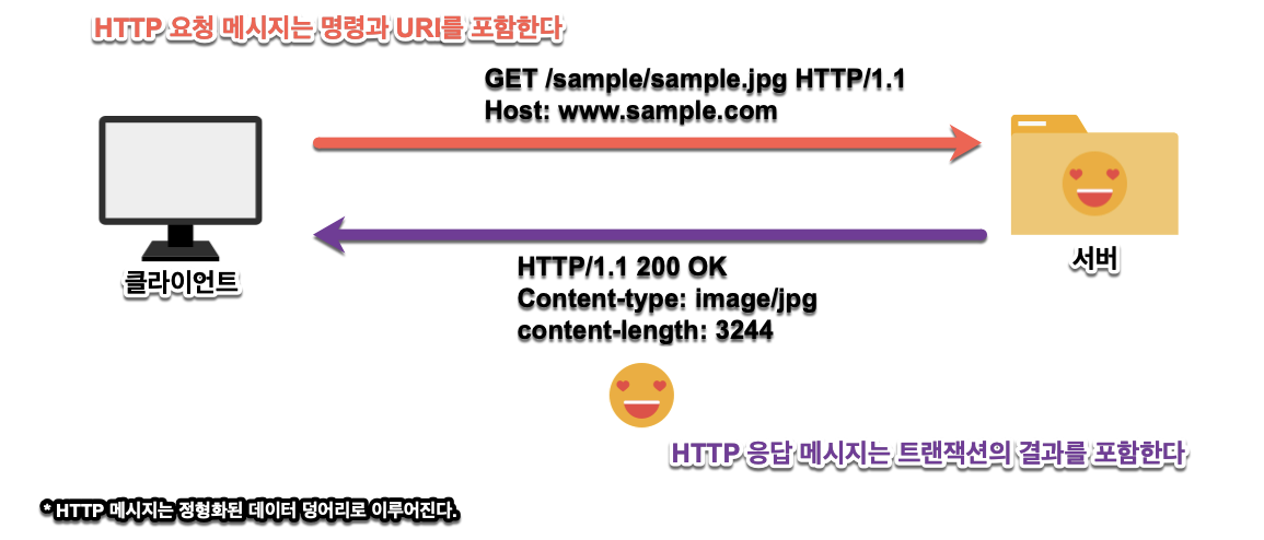 HTTP 트랜잭션은 클라이언트에서 서버로 보내는 요청 명령과 서버가 클라이언트에게 돌려주는 응답 결과로 구성되어 있다.