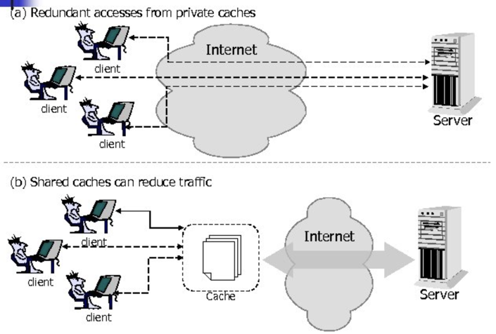 공용 캐시는 캐시 프락시 서버 혹은 프락시 캐시라고 불리는 틀별한 종류의 공유된 프락시 서버다. 프락시 캐시는 로컬 캐시에서 문서를 제공하거나, 혹은 사용자의 입장에서 서버에 접근한다. 자주 찾는 객체를 단 한 번만 가져와 모든 요청에 대해 공유된 사본을 제공함으로써 네트워크 트래픽을 줄일 수 있다.