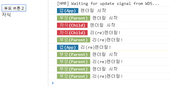 버튼을 아무리 클릭해도 자식은 리렌더링되지 않고 부모만 렌더링이 되는 것을 확인할 수 있을 것이다. 그렇다면 하위 요소는 어떤 것에 의해 다시 렌더링 될까? 정답은 바로 앱(App)에 의해 리렌더링된다.