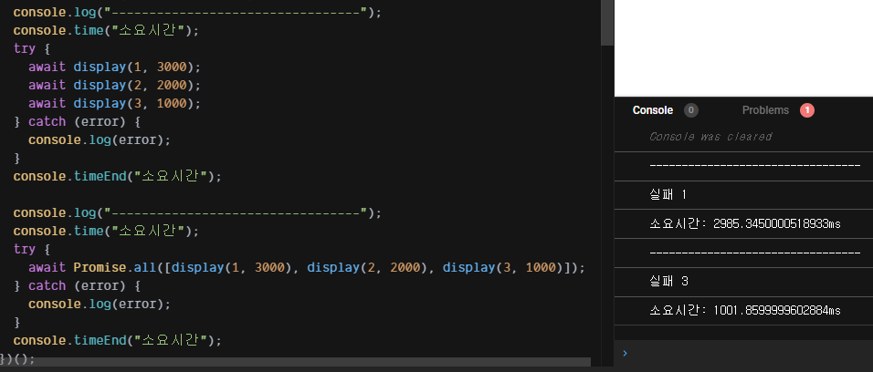 물론 각각의 함수를 await 하는 경우에도 1초가 걸리는 display(3, 1000)함수를 맨 위로 올리면 1초만 걸리고 에러를 반환하게 된다. 하지만 현실 세계에서 가장 에러를 빨리 뱉을 거 같은 함수를 찾아서 맨 위에 적는 건 사실상 어렵다. 그리고 Promise.all()이라는 대안이 있는데, 굳이 그럴 이유도 없는 것이다